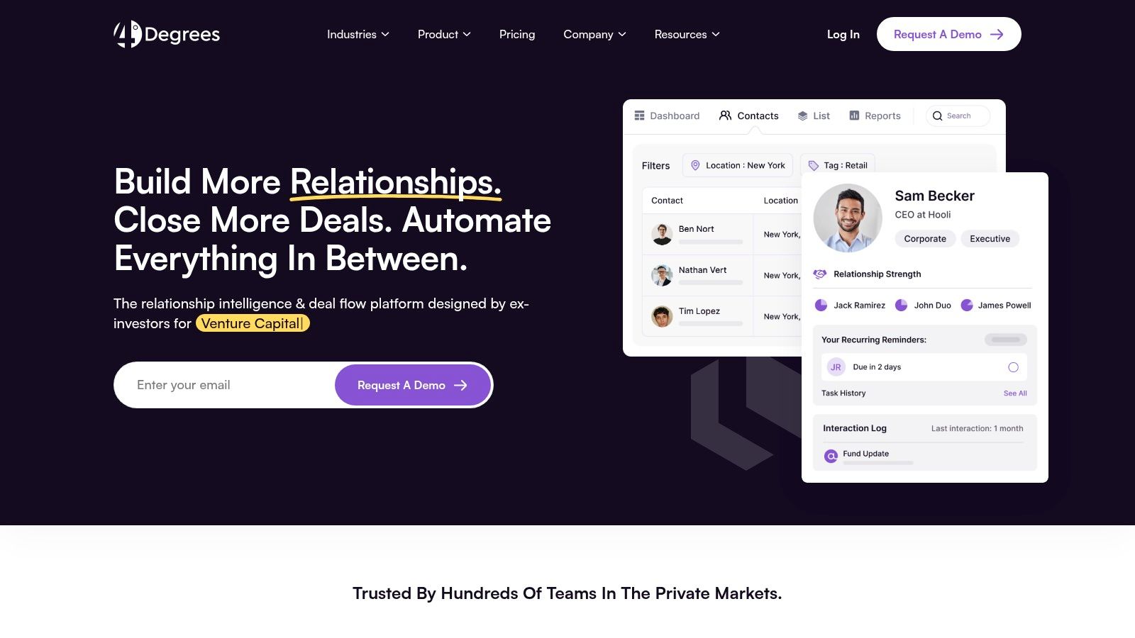 4Degrees is a relationship-intelligence CRM built by former investors who understand the networking demands of private equity and venture capital. Its primary focus is on automatically capturing team interactions and leveraging that data to reveal the warmest introduction paths to key targets. The platform moves beyond simple contact management by actively scoring the strength of relationships, providing a clear, data-driven view of a firm's network and helping teams prioritize their outreach efforts effectively.