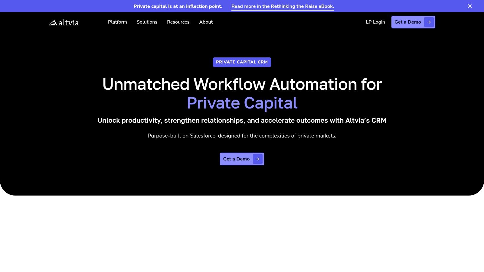 Altvia leverages the Salesforce ecosystem to deliver a purpose-built platform for private capital markets. It functions as a specialized layer on top of Salesforce, transforming the general-purpose CRM into a system tailored for the specific workflows of private equity, from fundraising and investor relations to deal management and portfolio monitoring. For firms already invested in or comfortable with Salesforce, Altvia provides a direct path to industry-specific functionality without requiring a migration to an entirely new ecosystem.