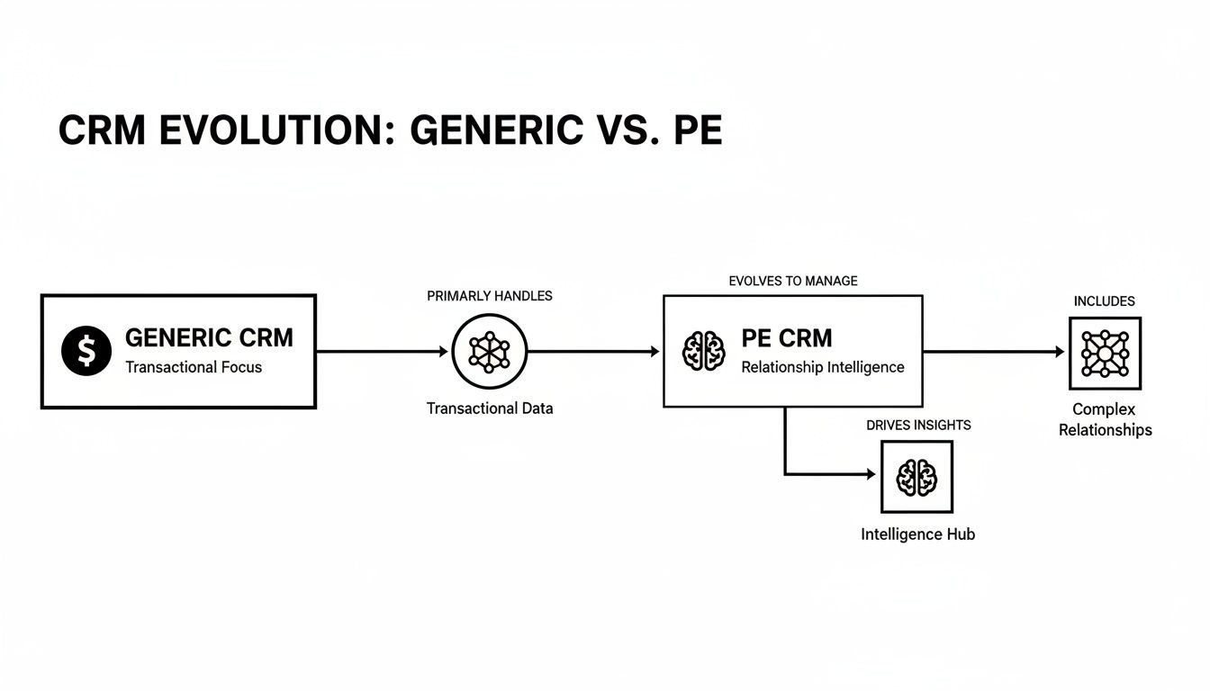 This diagram shows the evolution from basic, transactional CRMs to the complex intelligence platforms that modern funds demand.