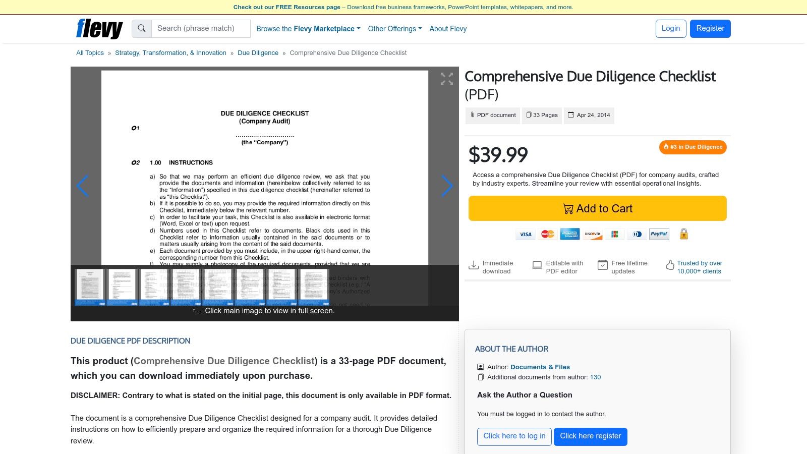 The marketplace model allows users to purchase and instantly download specific documents, like their popular 33-page comprehensive due diligence checklist. This caters to professionals who need a tangible, editable document to guide their initial review or to supplement their existing internal templates. The value lies in its directness and accessibility, providing a detailed framework that can be immediately printed or edited in a PDF tool to fit a specific transaction.