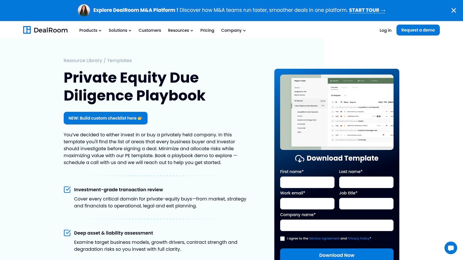 While DealRoom offers a view of their private equity due diligence checklist pdf template on their website, full access to the interactive playbook requires engaging with their platform. Typically, this involves requesting a demo or filling out a form to explore the software. This model is best suited for firms that intend to use DealRoom as their primary VDR and deal management solution, as the checklist's power is fully unlocked within that ecosystem. For those committed to improving their deal execution infrastructure, the integrated approach provides a significant advantage over standalone PDF checklists. To explore more about the foundational elements of this process, see this guide to private equity due diligence.